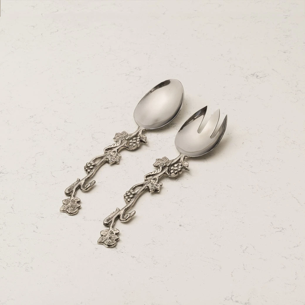 Made of stainless steel and brass with intricately carved details, our Grape Wine Salad Server set has an understated style perfect for any occasion.