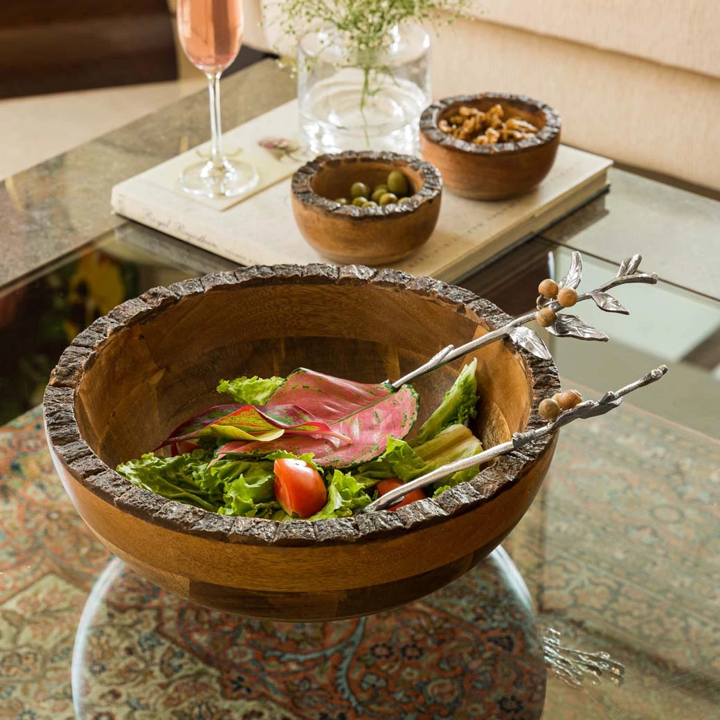 Our Rustic Bark Salad Bowl is hand carved by skilled artisans from seasoned mango wood. It features an understated design with a neutral natural finish adding a touch of wild to your dining table.