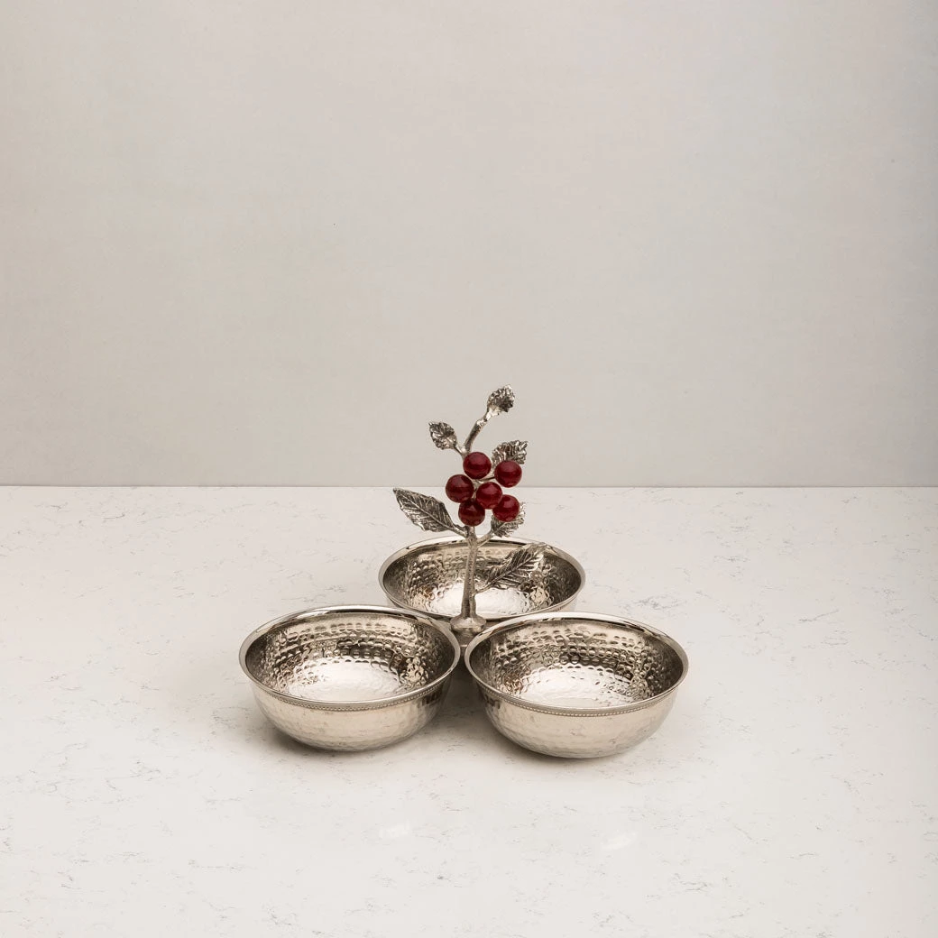 Our festive Red Berry Condiment Bowls made of nickel finish hammered brass are ideal for serving chips, dips, olives and condiments.