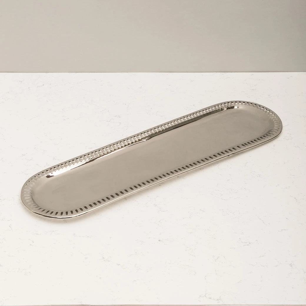 This magnificent oval serving platter is made of brass and treated with a nickel finish, bestowing upon it a shine. This piece is a symbol of elegance matched with radiance.