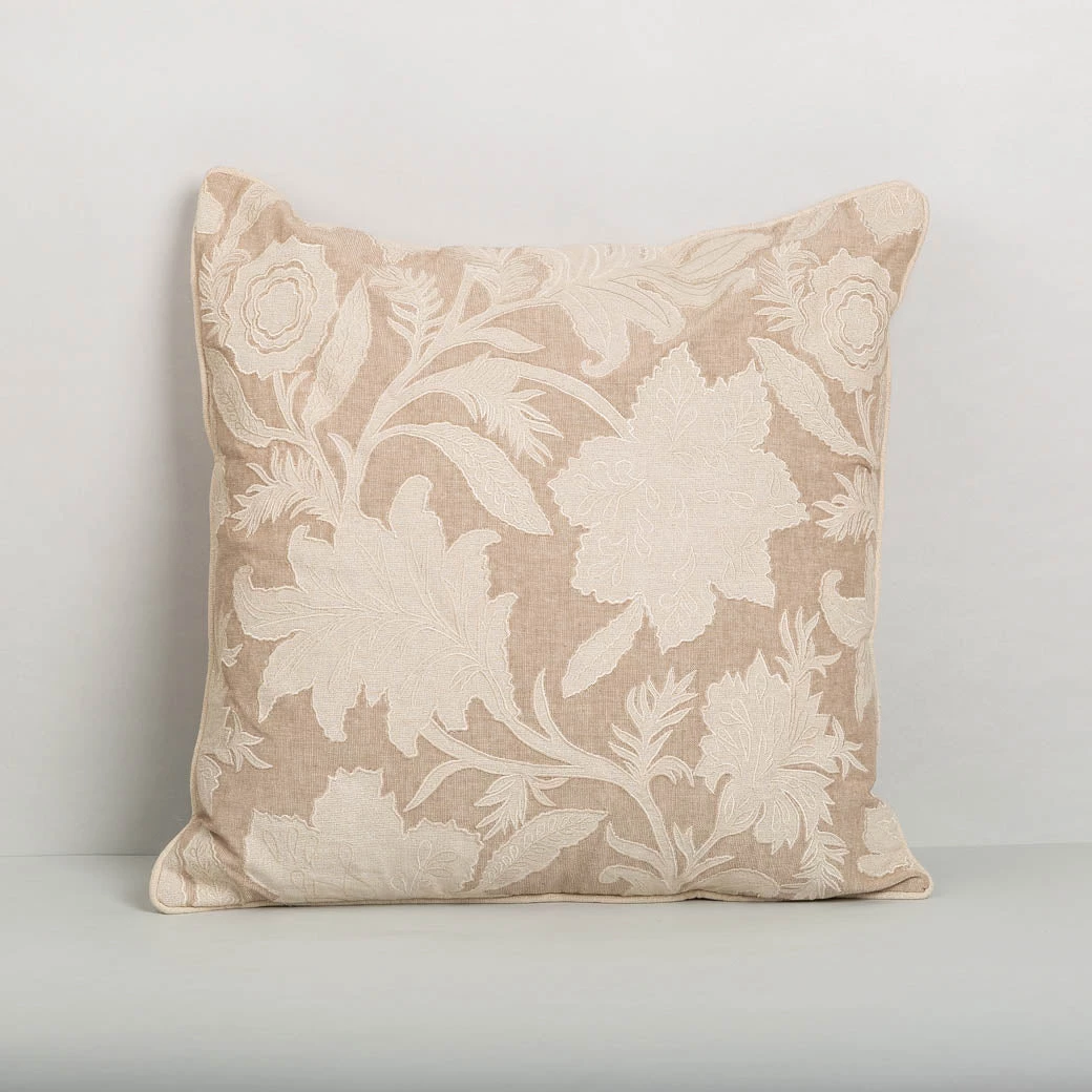 Our Antique White Embroidered Cushion featuring applique embroidery is certain to bring a hint of elegance to your living room.