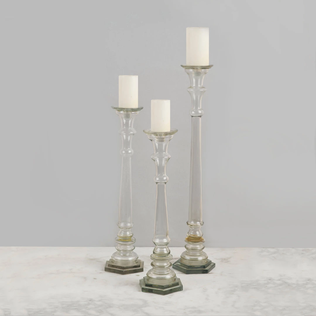 Add a finishing touch to your living space with our Olivia Candle Holders which are crafted of clear glass.