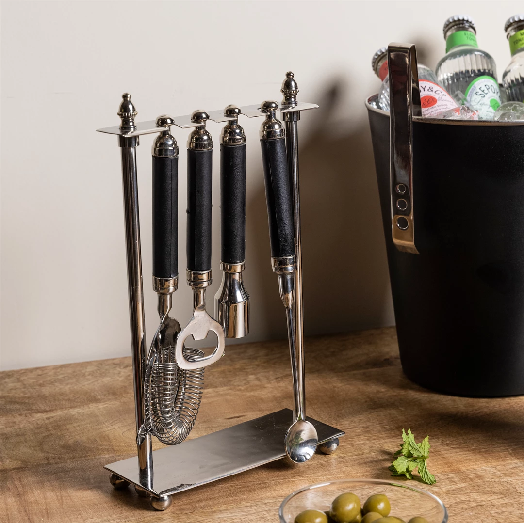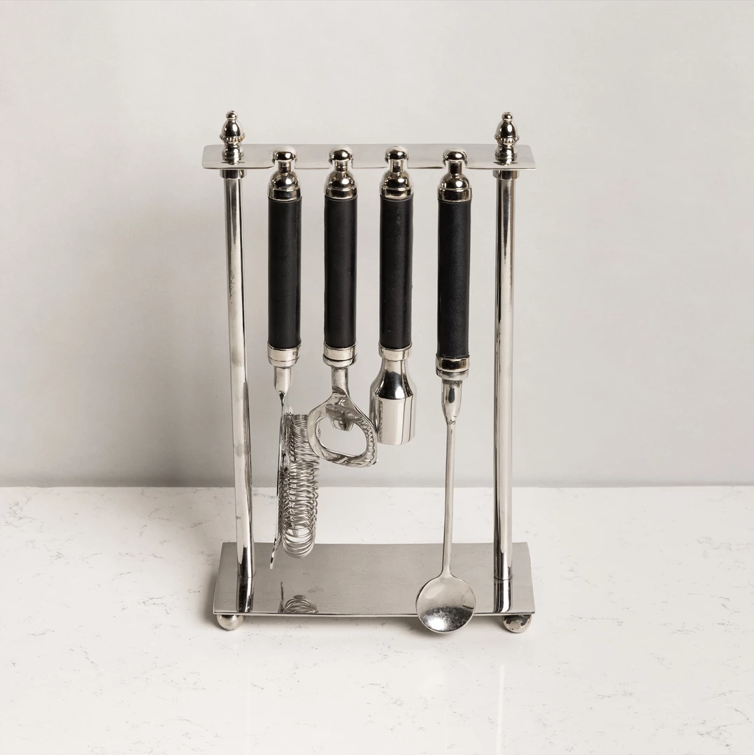 Our Mayfair Barware Stand and Accessories are a very appealing addition to your home bar and are a must-have for your next soiree. Includes a Strainer, Bottle Opener, Stirrer and Muddler.