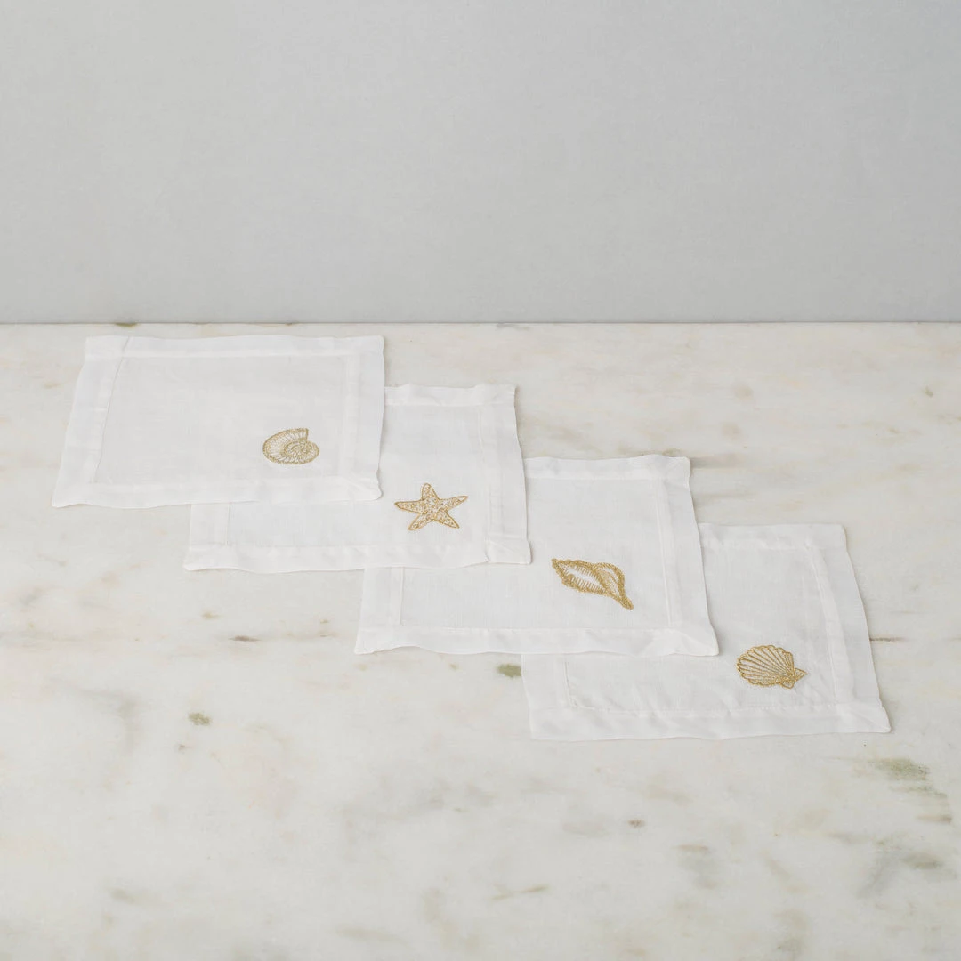 Make your next gathering extra special with our Marine Cocktail Napkins. Each set includes these motifs: Tulip Shell, Shell, Spiral Shell, Starfish.